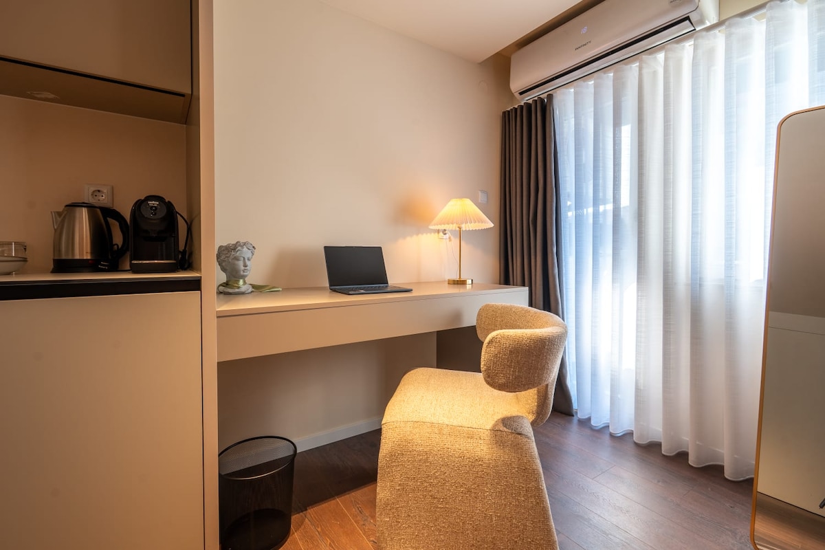 Vela 3 blends clean design with a refreshing feel. Ideal for travelers who appreciate a contemporary touch, it’s a stylish retreat that feels new every time you visit. Enjoy movie nights with your own cinema-style projector, turning the space into a private theater. The apartment features a fully equipped kitchen, private bathroom, dedicated work desk, and warm ambient lighting—perfect for relaxing or working in style.
