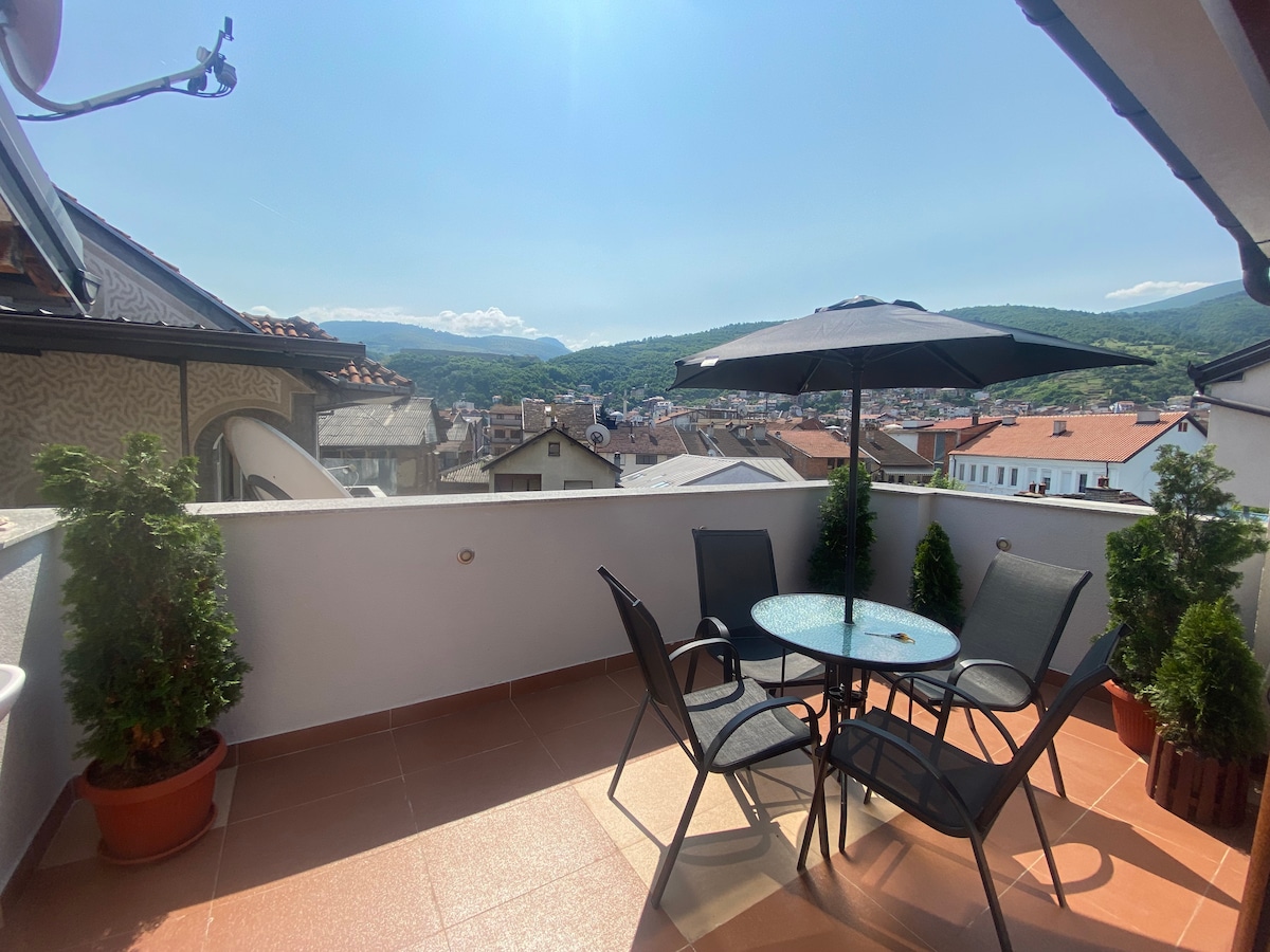 in Prizren offers family rooms with air-conditioning, private bathrooms, and city views. Each room includes a tea and coffee maker, hairdryer, work desk, and free toiletries. Guests can enjoy a bar and free WiFi, along with a 24-hour front desk, room service, and a 24-hour reception. the hotel is steps from Sinan Pasha Mosque, a 9-minute walk to Kalaja Fortress, and 500 metres from the Albanian League of Prizren Museum. Mahmet Pasha Hamam is a 3-minute walk away.