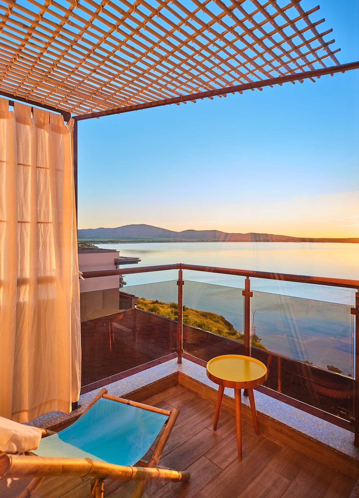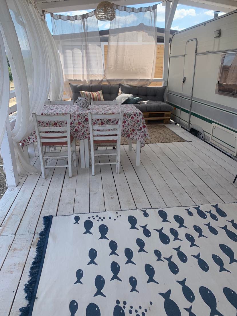 Незабравима ваканция на вълшебно място! Напълно обзаведена каравана, с изглед към морето и планината в затворен терасиран комплекс. Разкошна ветровита веранда, където можете да посрещнете изгрева всяка сутрин! Този уникален дом е специално проектиран да съчетава живот в каравана и на открито. Включва просторна баня, пералня и напълно оборудвана кухня. Само на 2 минути пеша от плаж и магазини! Похапвате в ресторант, готвите на верандата или приготвяте барбекю на тревата.