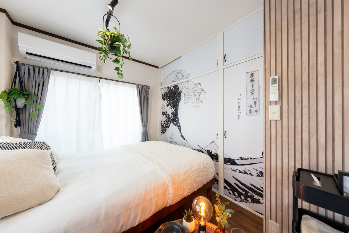 \2025年9月NEW OPEN!/ 千円札の名画・葛飾北斎「神奈川沖浪裏」、シャワールームには歌川広重「亀戸梅屋敷」。日本美術に包まれた唯一無二の宿で、非日常の体験をお楽しみください。 東武スカイツリーライン「五反野駅」「梅島駅」徒歩約10分。貸切宿で家族旅行や友人同士、リモートワークの長期滞在にも最適。※無料高速Wi-Fi完備 ■人気観光地へ簡単アクセス 日比谷線直通:上野16分、秋葉原21分、銀座35分、六本木45分、恵比寿50分 乗り換え1回:浅草25分、押上(スカイツリー)21分 ■徒歩圏内に便利なお店多数 スーパー:ビッグ・エー2分、マックスバリュ4分、まいばすけっと5分 コンビニ:セブンイレブン6分、ファミリーマート8分 【ご利用にあたってのお願い】 ■ 当施設は3階建てアパートの最上階に位置し、エレベーターはございません。お荷物はご自身で運べる方のみご予約ください。 ■ 最大3人まで宿泊可能ですが、推奨は大人2人+子供1人です。大人3人でのご利用はやや窮屈です。 ■ 管理人不在のため、清掃やシーツ・タオル交換はありません。備え付けの掃除機・洗濯機をご利用ください。