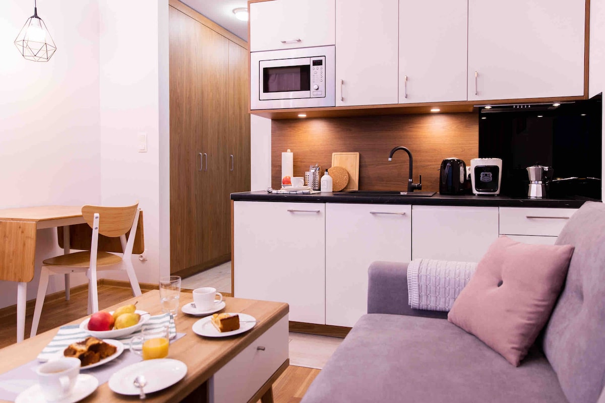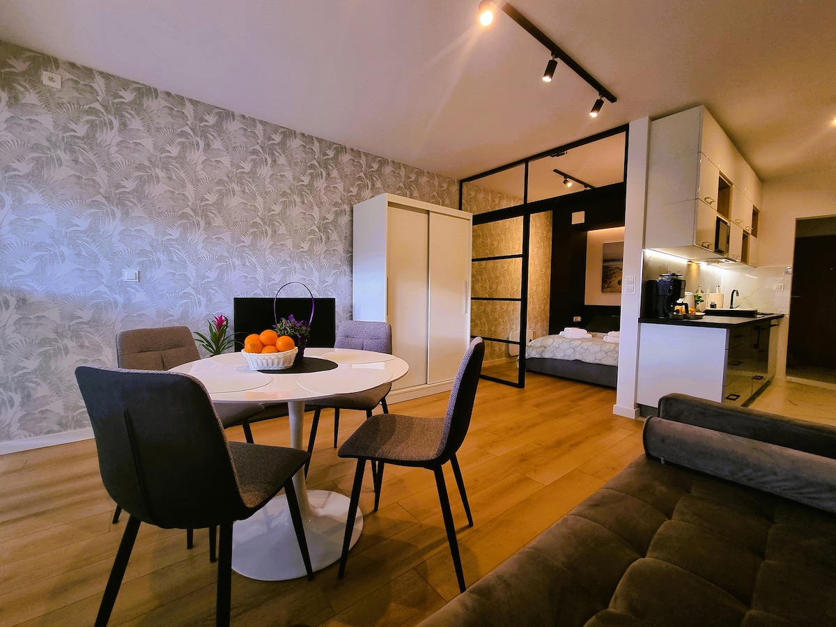 Oferujemy luksusowy apartament typu Studio, zlokalizowany na parterze z w pełni wyposażonym aneksem kuchennym oraz przestronną łazienką w czarno-białej kolorystyce. Oferta zawiera: - nocleg w luksusowym apartamencie, - możliwość bezpłatnego korzystania ze strefy Wellness: basen, sauna, jacuzzi, sala fitness - 90 minut dziennie (w zależności od wybranego apartamentu) - bezpieczny i bezpłatny parking - WiFi w apartamencie - możliwość korzystania z zewnętrznego placu zabaw dla dzieci