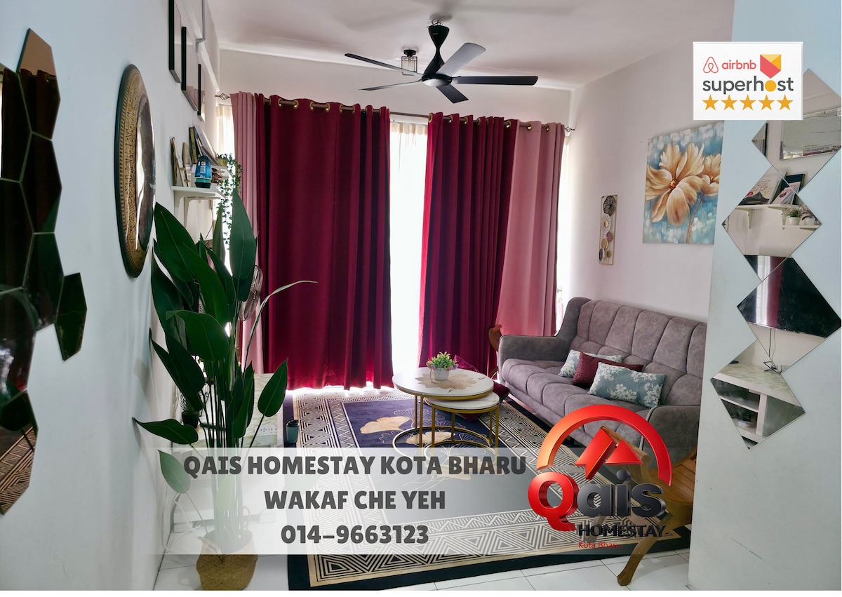 Qais Homestay terletak di unit 1A-05, hanya di tingkat 1, Residensi 3A Taman Iman Jaya berhampiran dengan pusat membeli belah popular di Kelantan, iaitu Wakaf Che Yeh. Jarak ke pusat bandar dan beberapa pusat membeli belah terkemuka di Kota Bharu hanya dalam lingkungan 10 - 15 minit dari sini. Homestay jenis apartment ini dilengkapi dengan perabot dan peralatan rumah termasuk kemudahan aircond di dua bilik utama pastinya membuatkan para tetamu berasa seperti berada di rumah sendiri.