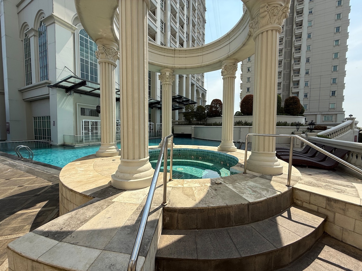 A fully furnished 2 BR penthouse at a luxurious 5 ⭐️ apartment with a breathtaking city view from hi floor balcony at Mirage Tower, the only tower among others in the same block with city view, the nearest & direct access to superblock of Mall Kota Kasablanka, one of the biggest mall in Jakarta with food court, supermarket, children playground & cinema. Near CBD, 10 min to Sudirman & Kuningan with complete facilities ie. outdoor swimming pool, jacuzzi, garden, fitness center, laundry.