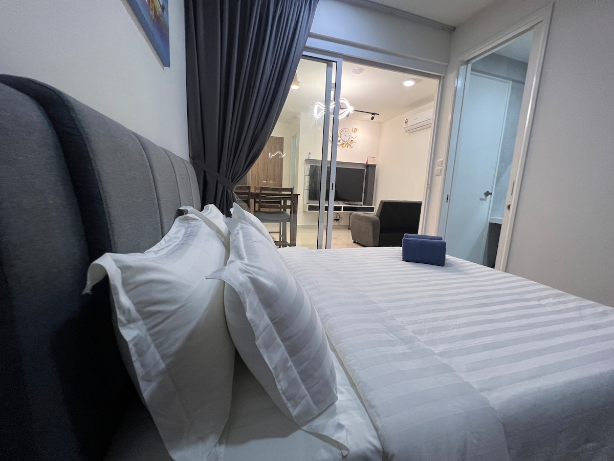 Stunning Sea view from the house. Chilling at the balcony. Swimming pool@level 6 Living Room, Queen Size bedroom, private sofa bed corner with curtains. Ensuite bathroom with hot and cold water shower. Large refrigerator with ice cube , mini kitchen with electric cooker, pot,plate,spoon,fork are available . Light cook at the kitchen. Filter water machine hot and warm. Please select 3 guest if you need single bed setting convert from sofa bed.