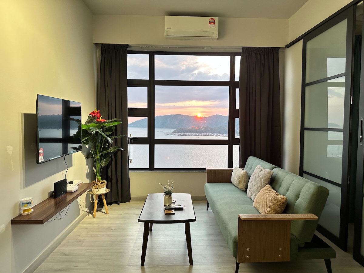 Stunning Sea view from the house. Chilling at the balcony. Swimming pool@level 6 Living Room, Queen Size bedroom, private sofa bed corner with curtains. Ensuite bathroom with hot and cold water shower. Large refrigerator with ice cube , mini kitchen with electric cooker, pot,plate,spoon,fork are available . Light cook at the kitchen. Filter water machine hot and warm. Please select 3 guest if you need single bed setting convert from sofa bed.