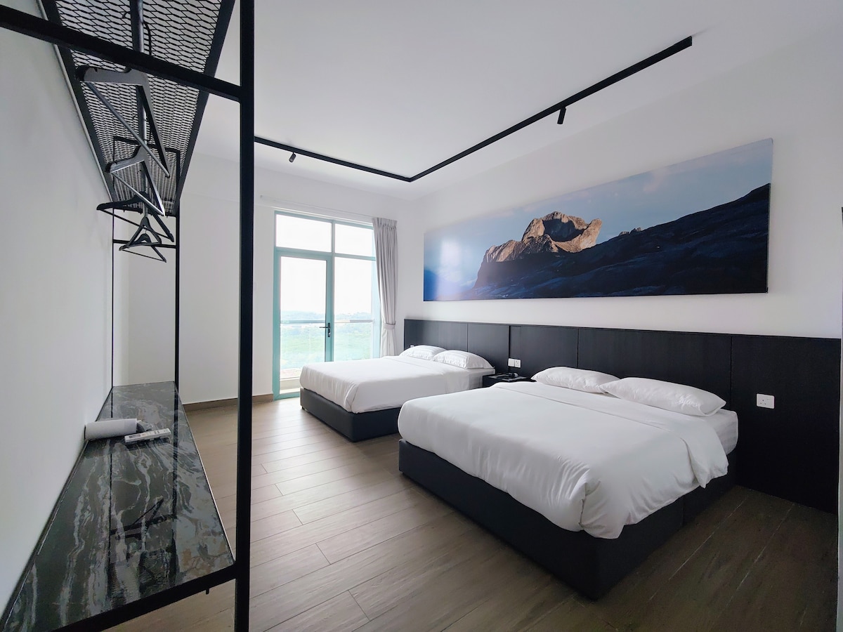 Master bedroom with a separate living room and a balcony with a calming mountain view. Located at a 4-star Hotel at Gaya Street, the central spot of Kota Kinabalu, within 3-minute walking distance to Suria Sabah, Jesselton Quay, night markets, and Sunday market, numerous must-visit top local restaurants such as Shoney's, Merah Merah Korea, and On 22, also equipped with a swimming pool with a sea view, this will be a perfect place for you.