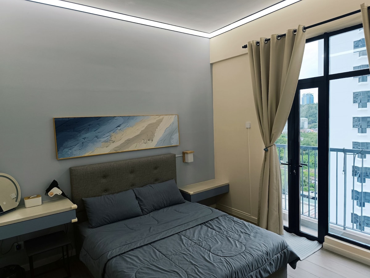 Stunning Sea view from the house. Chilling at the balcony. Swimming pool@level 6 Living Room, Queen Size bedroom, private sofa bed corner with curtains. Ensuite bathroom with hot and cold water shower. Large refrigerator with ice cube , mini kitchen with electric cooker, pot,plate,spoon,fork are available . Light cook at the kitchen. Filter water machine hot and warm. Please select 3 guest if you need single bed setting convert from sofa bed.