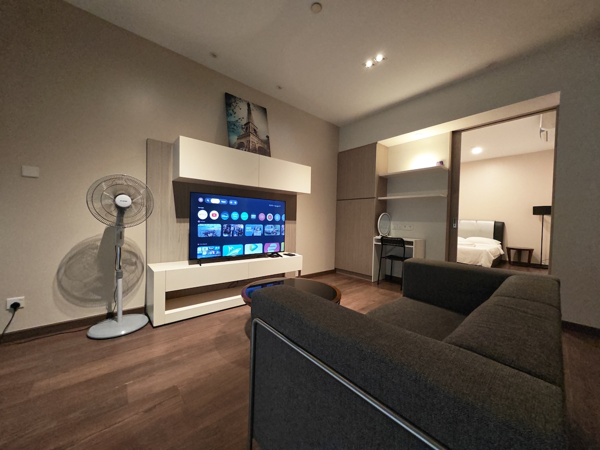 Stunning Sea view from the house. Chilling at the balcony. Swimming pool@level 6 Living Room, Queen Size bedroom, private sofa bed corner with curtains. Ensuite bathroom with hot and cold water shower. Large refrigerator with ice cube , mini kitchen with electric cooker, pot,plate,spoon,fork are available . Light cook at the kitchen. Filter water machine hot and warm. Please select 3 guest if you need single bed setting convert from sofa bed.