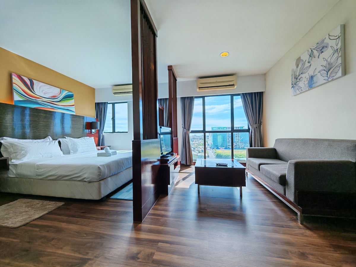 DELUXE STUDIO SUITES ~Sunset • Seaview Solo | Romance Couple | Business Trip | Small Family Bed Type : 1 King Bed & 1 Sofa Bed ( Chargeable ) Sunset Tanjung Aru & Seaview Level : 10, Size : 592 sqft ~ 豪华单间日落•海景套房 ~ SOLO |浪漫情侣 |闺蜜同床|出差 | 小家庭 床型:1 张大床 (二位) 可安排另加1 张沙发床(另收费) 楼层:十楼 面积:592 平方英尺 车程:~亚庇机场- Queensland Suites ( Aru Suites ) : 7-8 分钟 GRAB:约马币6-8 Aru Suites - Imago Shopping Mall / 大茄来/市区/ : 约 7-10分钟 GRAB:约马币6-10 步行约 10分钟 (捷径)丹绒亚卢海边 附近吃的:Burger King / KFC / 本地咖啡店/历史悠久1968北京鸭老店/等