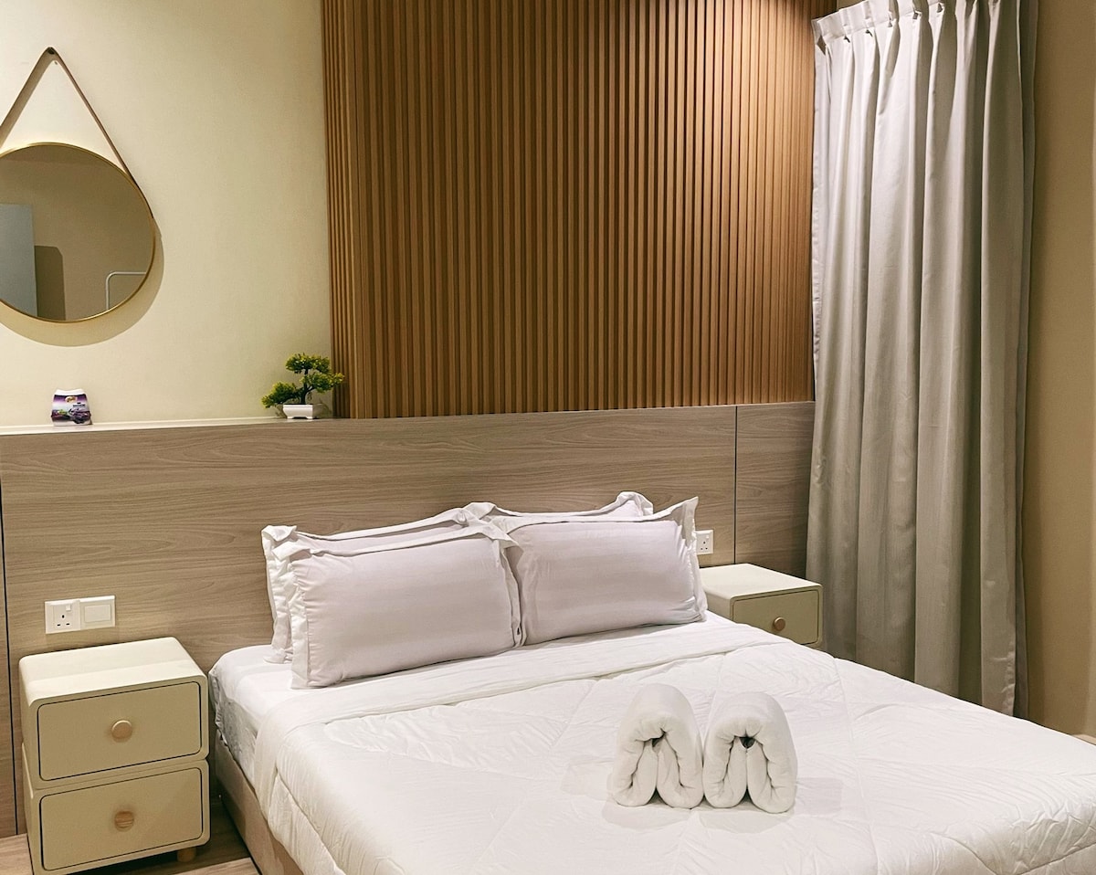 Stunning Sea view from the house. Chilling at the balcony. Swimming pool@level 6 Living Room, Queen Size bedroom, private sofa bed corner with curtains. Ensuite bathroom with hot and cold water shower. Large refrigerator with ice cube , mini kitchen with electric cooker, pot,plate,spoon,fork are available . Light cook at the kitchen. Filter water machine hot and warm. Please select 3 guest if you need single bed setting convert from sofa bed.