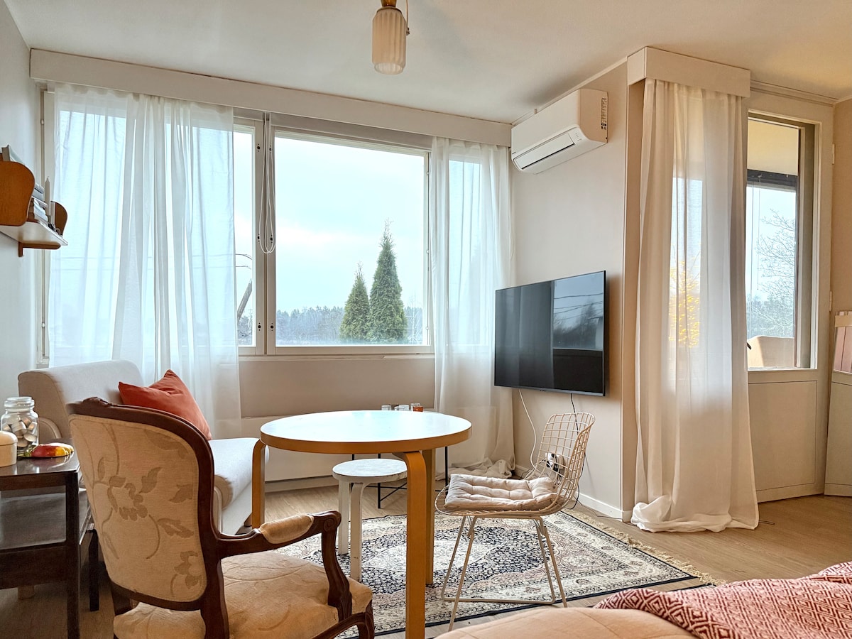 A fully equipped apartment (45m2) with two rooms and small kitchen. The apartment is in an apartment building sesigned by Alvar Aalto and it is furnished mainly with Aalto furniture. The apartment is about 13km from Kotka city center and 3km from the Karhula local commercial center. Aalto-henkinen, valoisa kaksio (45m2) Hyvin varusteltu, laadukkaasti kalustettu asunto lyhytaikaiseen tai vähän pidempään kayttöön. Asunto on kauttaaltaan remontoitu keväällä 2023.
