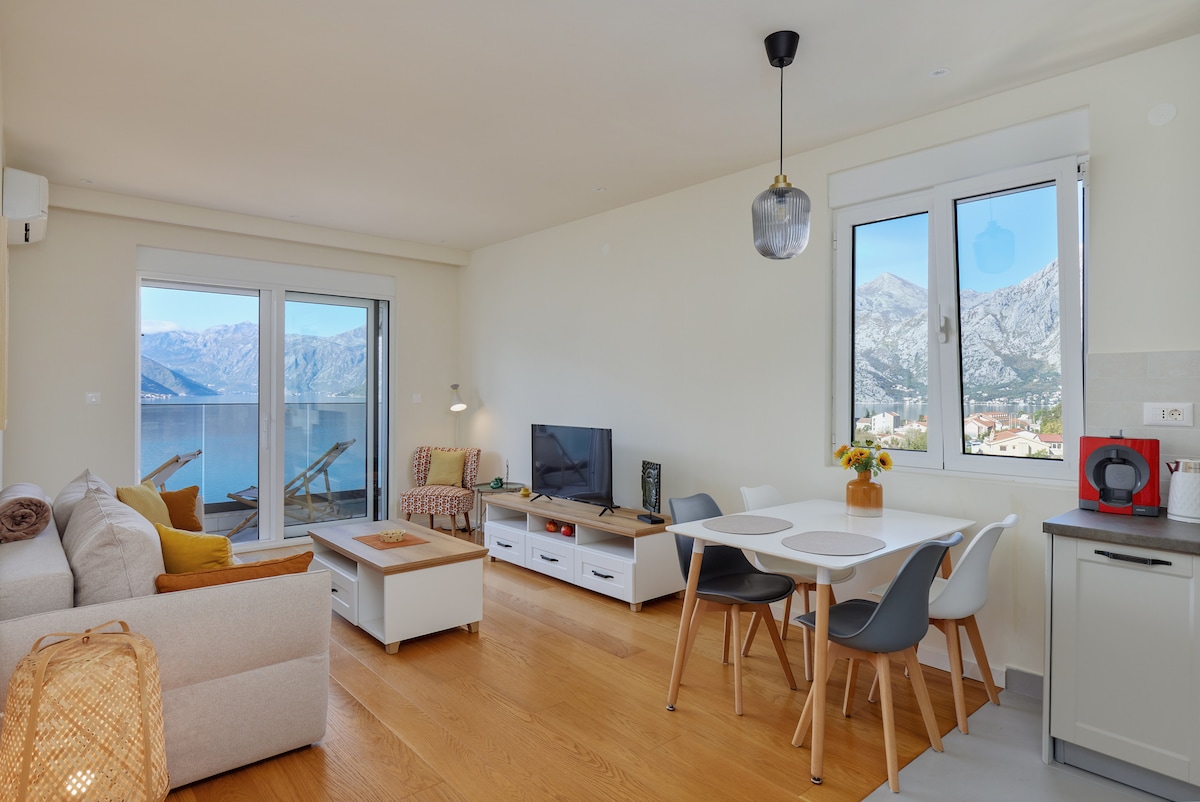 Beautiful panorama view over the bay of Kotor, harbour and old town is the first impression you will get from this 65m2 apartment. During the stay, you will enjoy an outstanding view of luxury cruise ships during early morning arrival or late afternoon departure from port of Kotor. This is a completely new apartment located inside a luxury residential complex, the apartment is fully equipped with free public parking, free wi-fi.The apartment is located 500m from the sea and 1.5km from downtown.