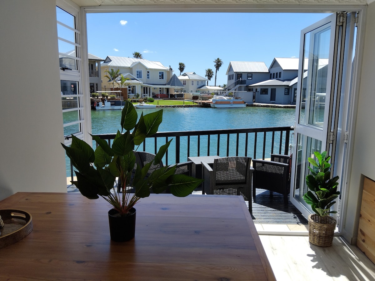 This easy living family home is situated on the water's edge of the renowned canal system with its own Jetty & beach. Main bedroom king bed, en-suite bathroom. 2 queen-sized bedrooms with inter-leading bathroom. Above garage is twin room with en-suite bathroom. House has everything needed-open plan kitchen leading onto dining room & undercover braai area. Comfortable lounge with fireplace leading to braai area & patio. patio-outside table with umbrella & benches overlooking canal & sun lounge.