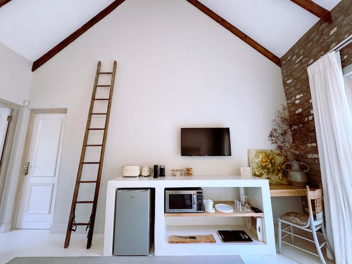 A large bright upstairs room above a double garage with a private balcony. The room looks out over trees and the garden. Private, equipped, self-catering with a small kitchen area. It’s a short walk to the Krom river. Guests have access to the garden, jetty and canal. There is a canoe to use. We live in the main house a few metres away.