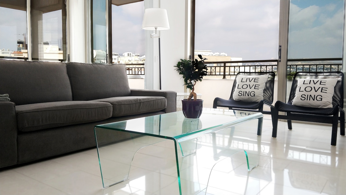 Located behind King Avenue Mall,our cozy and bright apartment will make your vacation more special. Large living room with sofa and dining area, Nespresso machine, smart tv,dvd collection,small library,working station,fully equiped kitchen , terrace with sunbeds,our top floor apartment has an amazing location,close to the beach,harbour,archeological sites and various restaurants and bars.Main bus station is walking distance,old town is easy to access walking and big supermarket 5 minutes away!