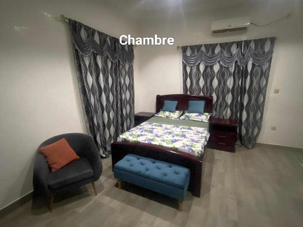 Bienvenue dans une maison moderne! 3 chambres, salon, terasse, jardin privé avec paillote, réserve d’énergie grâce aux panneaux solaires et réserve d’eau pour un confort ininterrompu. Sécurité renforcée avec installations fiables. Proche de l’aéroport international et supermarchés à 5 min. Équipements complets : Wi-Fi, climatisation, cuisine équipée, machine à laver etc. Services additionnels possibles. Idéal pour familles, professionels, courts et longs séjours. Vivez Bamako en toute sérénité !