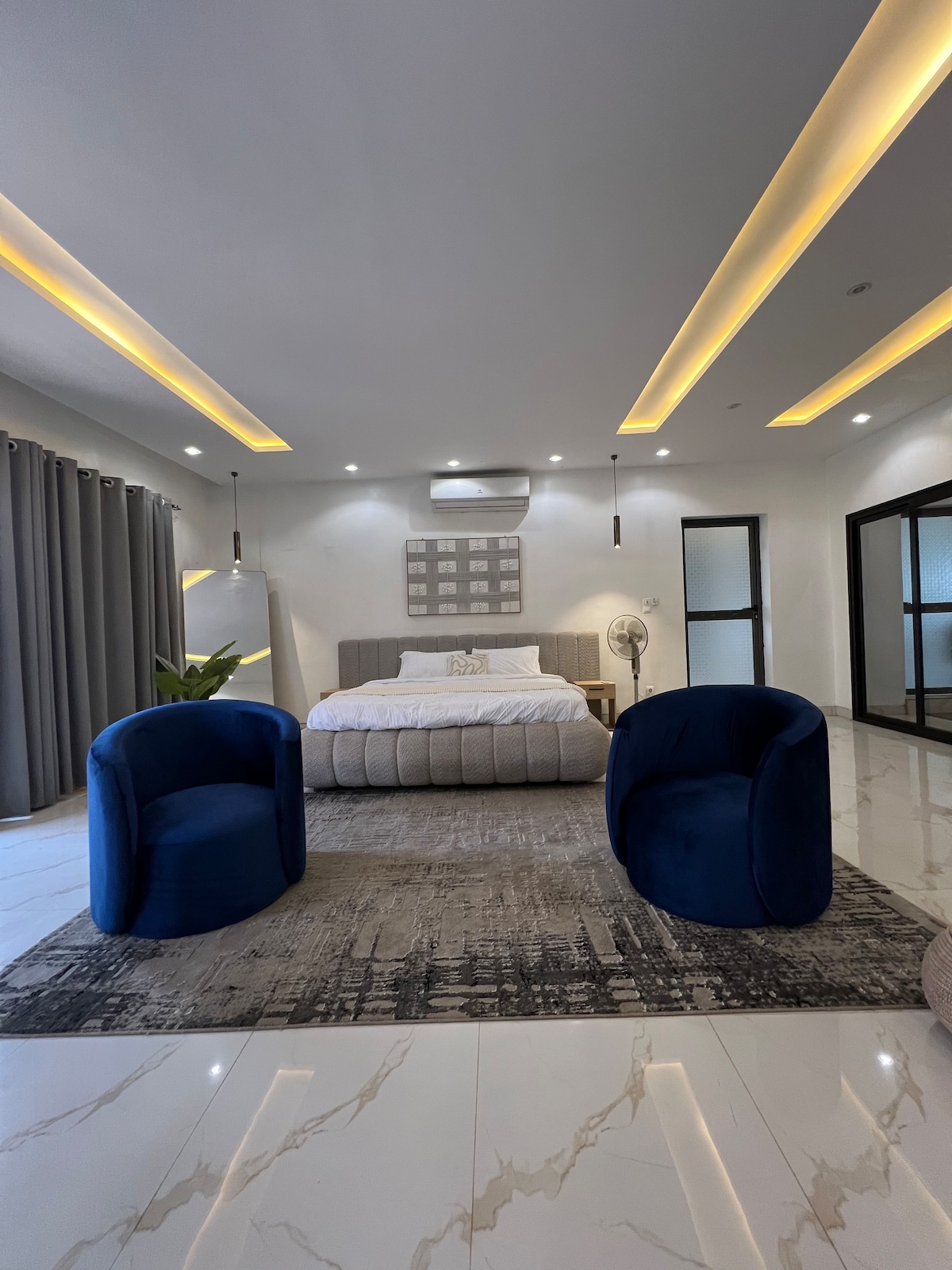 Bienvenue dans cette spacieuse suite, idéale pour les professionnels comme pour les voyageurs en quête de confort et de tranquillité. Elle dispose d’une entrée indépendante, offrant liberté et intimité, d’un espace nuit confortable, d’un coin salon agréable et d’une kitchenette pratique pour les repas légers. Climatisée 24h/24 grâce à une grande installation solaire, la suite bénéficie également du Wi-Fi, d’une TV et d’un ménage quotidien. Située dans une résidence calme et sécurisée.