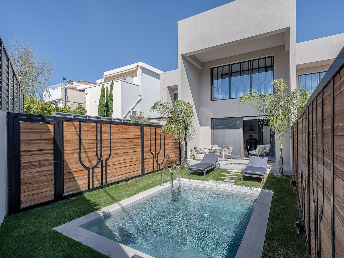 The second floor with the living room, dining room and open plan kitchen, a bedroom with two single beds, a den with the “Turkish” couch that can easily host a 5th individual in the residence if necessary and a bathroom with a closed shower. The rooms of the second floor have access to a garden with a dining table, six chairs and an umbrella offering ample shade.