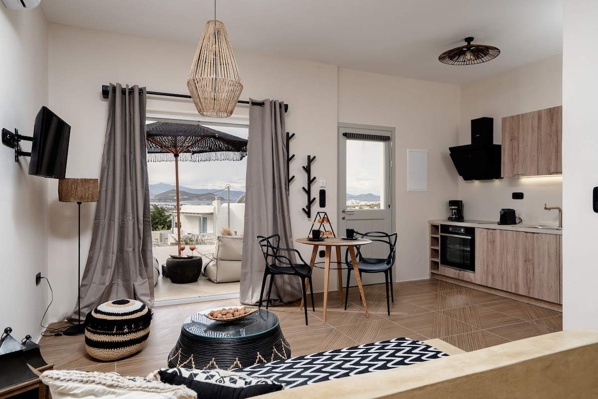 Nested in Naxos Town with stunning views out to the Aegean Sea we offer out guests the opportunity of an exclusive upretentions relaxing experience. Within easy reach from island’s famous PORTARA and Venetian Castle. Our philosophy is to offer first-rate hospitality coupled with unrivaled privacy. Much more than a home our deluxe suite offers supreme comfort combined with elegance style and unique Greek hospitality. it’ s warm minimal lines create a relaxing atmosphere.