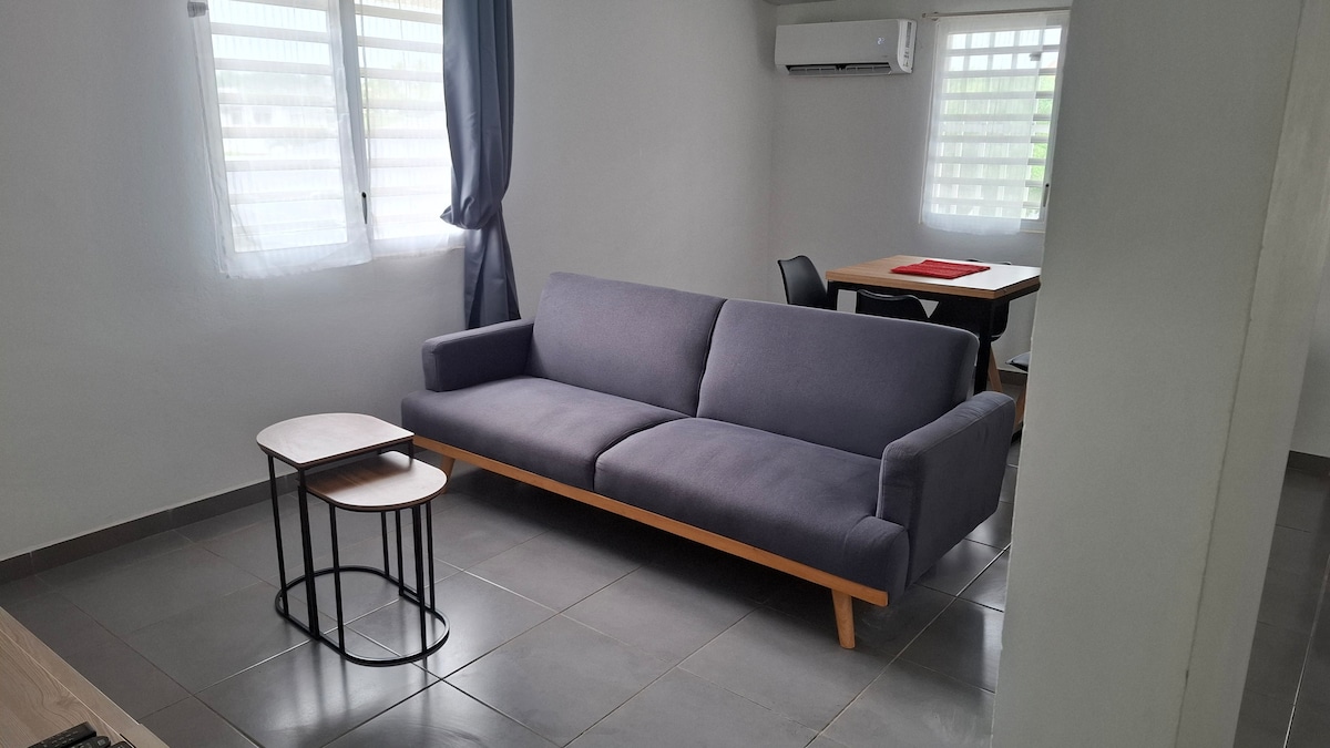 Profitez d'un logement élégant situé dans la zone animée de la Zac Hibiscus, idéalement placé, vous trouverez des restaurants et l’Université à proximité. Ce logement climatisé est idéal pour les personnes seuls ou les couples, il dispose d'un balcon qui donne sur la route qui mène aux restaurants. À votre disposition équipements de cuisine, draps, serviette, internet, Netflix. Lit 160x200. Au rez-de-chaussée de la résidence vous trouverez une laverie et sur le balcon un étendoir.