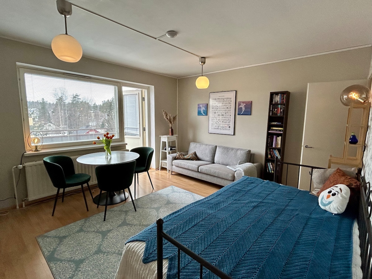 The beautifully renovated one bedroom apartment will serve you during your stay. The apartment has a sauna and a washing machine. The kitchen has just been renovated and is equipped with with modern equipment. The bedroom has twin beds and the living room has a double sofa bed. If necessary, a bed for a baby is also provided. The apartment has a beautiful décor and large windows to the evening sun. Welcome!