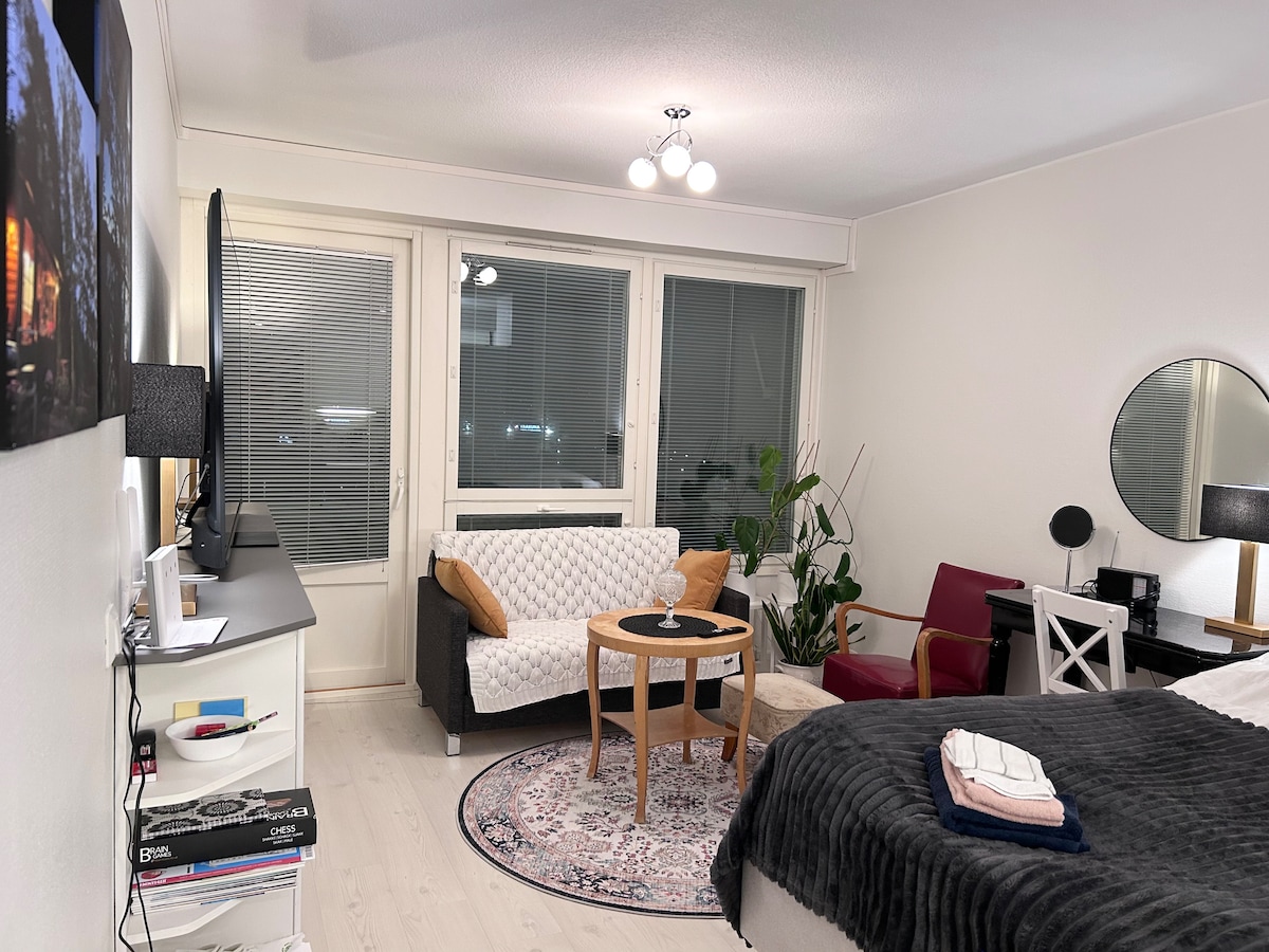 You can borrow my studio home located in city center of Kouvola. My home is across the market square. Neighbors are rather elederly people. Some noise you can hear ofcourse, since it s a question about appartmentbuilding from 1970. I have a dog, chihuahua Mila, so even though I clean up, its possible to find some hair. Mine or Milas. So my home is not suitable for dog-allergic persons. For the sleeping, I have a 120x200 size of a bed. Its very good for one person, but bit tight for two.