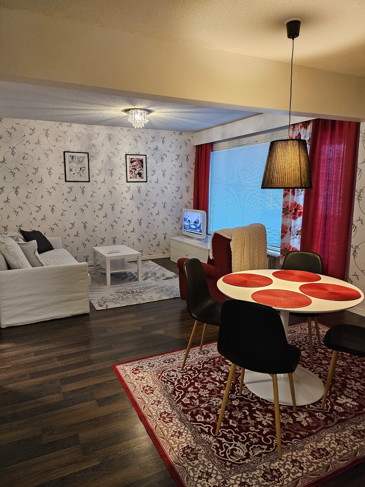 The beautifully renovated one bedroom apartment will serve you during your stay. The apartment has a sauna and a washing machine. The kitchen has just been renovated and is equipped with with modern equipment. The bedroom has twin beds and the living room has a double sofa bed. If necessary, a bed for a baby is also provided. The apartment has a beautiful décor and large windows to the evening sun. Welcome!