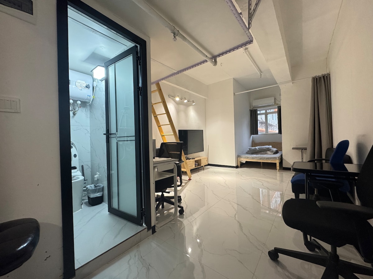 Enjoy a stylish experience at this centrally-located converted loft-style commercial space with a king bed, natural light, workspace, modern design, fast and stable wifi, washer/dryer, exercise equipment, folding bike, ample storage space, TV with Netflix and Playstation, Roomba, and a rooftop. The apartment is a 5-floor walk up located 1-min walk from Sheung Wan MTR station. The location is very convenient. The kitchenette is basic with an induction, toaster oven, steamer, utensils, etc