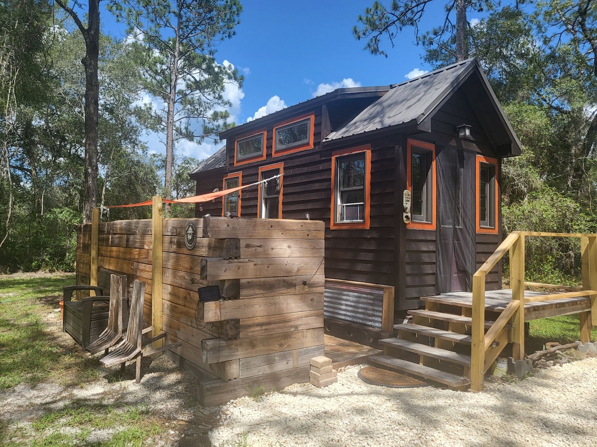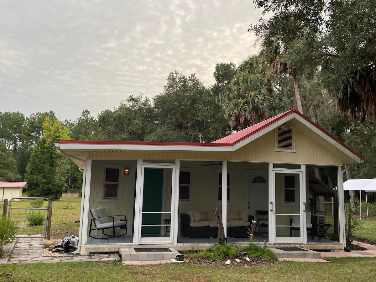 Get away from it all! Our tiny cottage (The Lilly) is available only. These 2 cottages are located on 1 acre. Each cottage features a fenced back yard. Nestled between the cottages is the court yard. Hot tub pending repair. Layout: Studio style, 2 Lofts- storage & lounge. Well water, star link internet, Roku . Bring your boat(s)/ sxs/ atvs. We are located 15 mins to Lake Rousseau, Gulf, Three Sisters Springs, & Rainbow River. In the country.