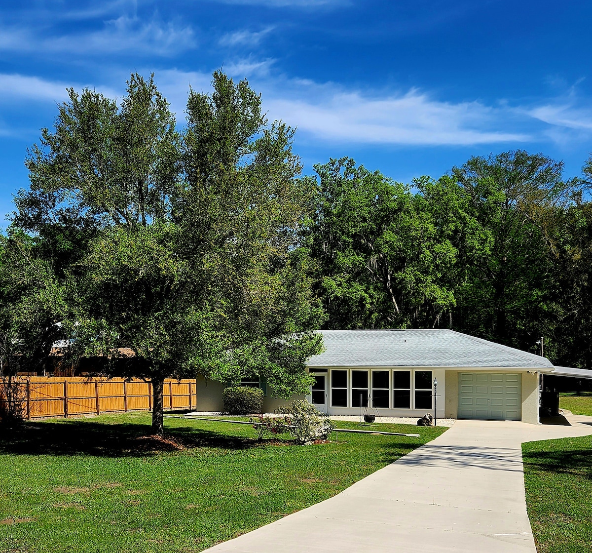 ☀Stunning sunsets on Lake Rousseau ☀Enjoy the glistening lake, natures sounds, and stunning views from your screened-in porch, dock or fire-pit ☀Activities: OK! Perhaps some corn hole or football on the manicured lawn if you are not too mesmerized by the sun glistening off of the water, the birds landing on the lake, or the many 300 y.o. Live Oak trees with Spanish moss that provide shade and filtered sunlight ☀Grill and then end the day with Sunset, peaceful sounds and S'mores on your bonfire