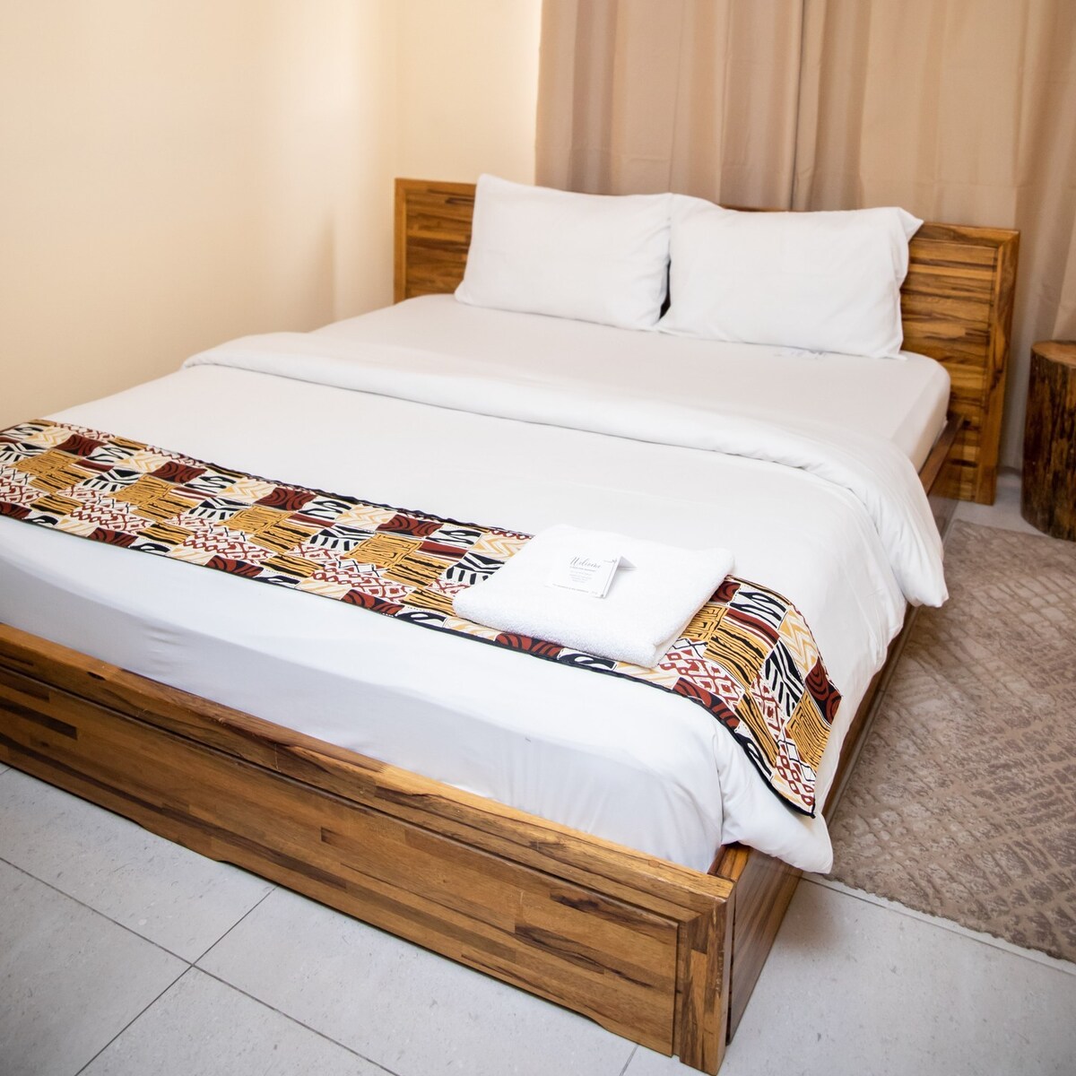 RNA Apartments has luxurious fully furnished studio bedrooms for short stay. The apartments which are equipped with fine furnishings has serviced en-suite Double/Queen size rooms located in a private and an exclusive plush West Trasacco residential neighborhood in Accra, 8.7km from Kotoka International Airport and 150m from 4syte TV station. The 3-storey Apartment feature free WiFi throughout the building and each apartment comprises: lounge/dining, kitchenette, bedroom, study and bathroom.