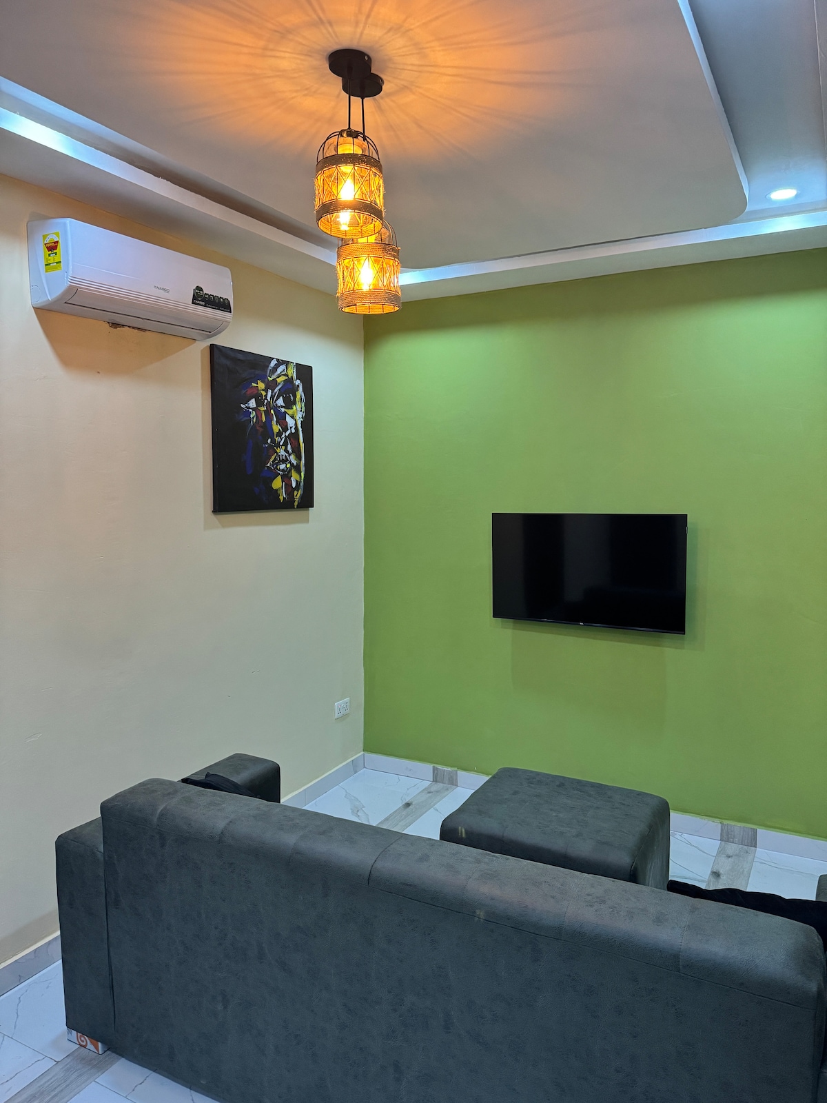 This Is A Fully Furnished Condo Apartment With One Bedroom And A Living Room. The Place Is Centrally Located Approximately 25 Minutes Away From Kototoka International Airport And 10-15 Minutes Away From Accra Mall. The Place Is Furnished With A Comfortable King-Sized Mattress, Two Air Conditions, High Speed WIFI Internet, A Fully Functional Kitchen, A Dedicated Working Space And A Washroom Borteyman Stadium (7 mins walk) China Mall (8.1 km) Tema Hospital (9km) Restaurants/Shops-Walking Distance