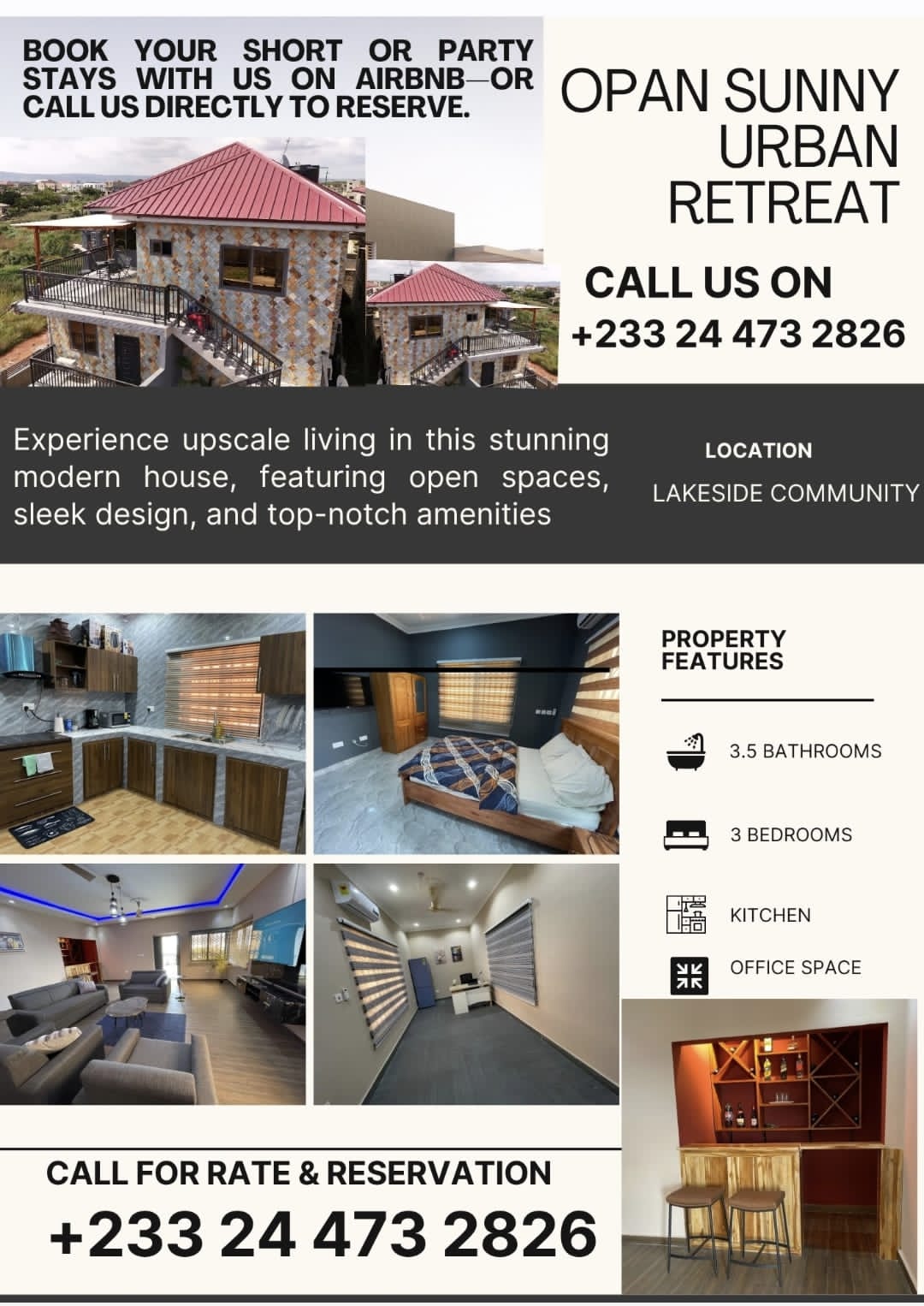 Hosted by: Isaac & London eye luxury home and Apartments accredited. This elegant 4-Bedroom En-Suite House features: ✨ 2 Spacious Living Areas ❄️ Fully Air-Conditioned Rooms 🏊♂️ Private Swimming Pool 🧹 Regular Cleaning Service ⚡ Standby Power Supply 🔊 LG Bluetooth Sound System 📺 Smart TVs + DStv 🌐 High-Speed WiFi 🧺 Washing Machine 🚗 Airport Pick-Up & Drop-Off Service Located just minutes from Combos & Casa Event Center,Fresh & Fit Gym & Restaurant,Nanakrom Melcom.