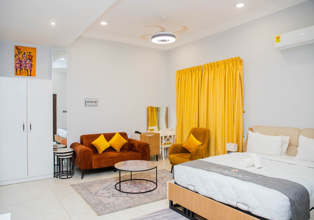 Experience the comfort of this luxurious one-bedroom suite, offering exceptional value just a proximity from the airport, A&c Mall and Accra Mall. Enjoy nearby restaurants and shopping. Suite features a rooftop terrace with breathtaking views, an outdoor dining area on the ground and rooftop levels, a swimming pool, reliable Wi-Fi, 24h power supply and security. located in center of East Legon, at the heart of Accra, tarred smooth road neighborhood, it’s thoughtfully designed for your comfort