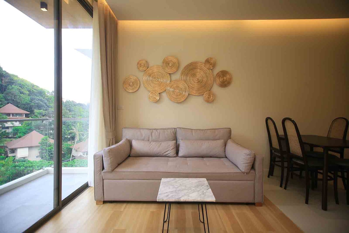 Ideal relax for Couples and Family. Sunny apartment with the best location in Ao Nang - 7 minutes walk from 2 beaches - Noppharathara and Ao Nang. It has an airconditioned bedroom with comfortable king size bed, separated from the living room with a sliding door. Convertible sofa allows the accommodation of two more guests. Fully equipped kitchen and dining area with TV. A balcony with a view of a green hill full of birds. Common pool, sauna and gym.
