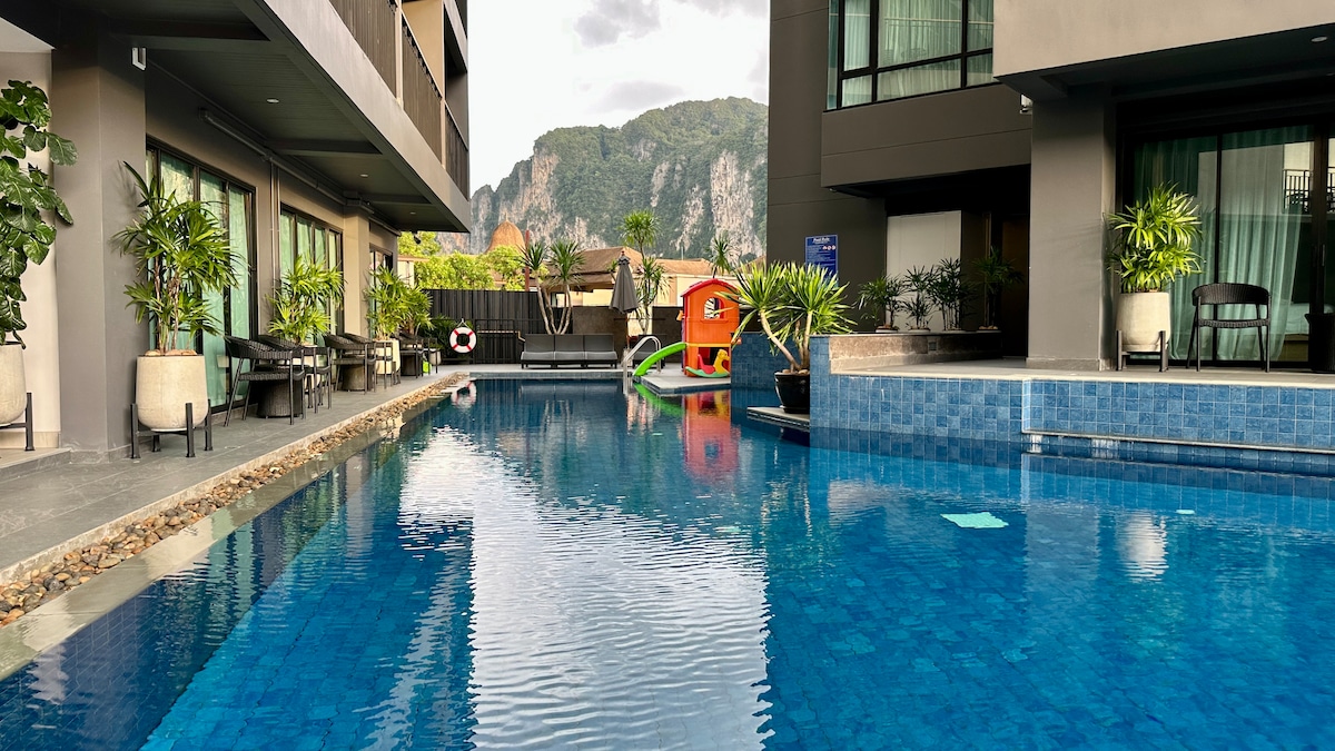 For guests hoping to see breathtaking sunsets, the Silk Ao Nang Serviced Apt is conveniently located 300 meters from Ao Nang Beach. Situated in the centre of Ao Nang, around restaurants, retail stores and services like booking a tour. This unit offers a sea view due to its location on a gorgeous lower hill slope, which is easily accessible by walking or free shuttle service. Additionally, you have access to the swimming pool, a fitness centre, and free WiFi, making it ideal for family holidays.
