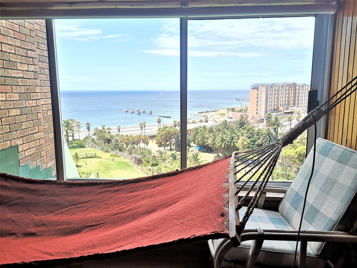 This stylish apartment has 180 degree view of the ocean in the peaceful hamlet Seaview, 40 minutes from Addo Elephant Park and 20 minutes from airport. With 2 bedrooms, 2 bathrooms, lounge, kitchen, fibre WiFi, DSTV, braai & shared pool. Lounge & 1 bedroom have seaviews & deck in front of lounge for sundowners viewing the ocean just across the road. We have our own safe water supply. Neighbour Alan Tours offers daily tours to Addo & other neighbour Raggy Charters offers whale watching trip