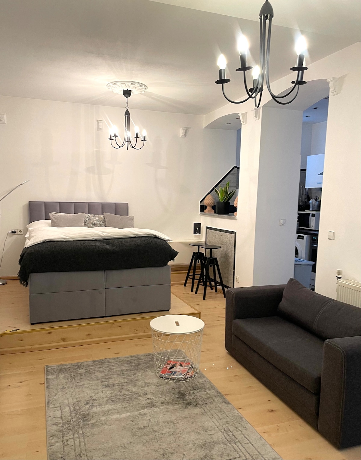 Das Altstadt-Heusel-Loft ist eine stylische Einzimmer-Dachgeschosswohnung, mit eigener Dachterrasse, luxuriöser Küchenzeile und einer Klimaanlage. In der Wohnküche steht das Schlafsofa mit Topper, auf dem bequem ein bis zwei Gäste schlafen können. Das Bad ist komfortabel mit Doppelwaschtisch und großer Dusche und einer Waschmaschine ausgestattet. Unser Loft liegt im zweiten OG und ist nur über eine Treppe zu erreichen, die wir gemeinsam nutzen.