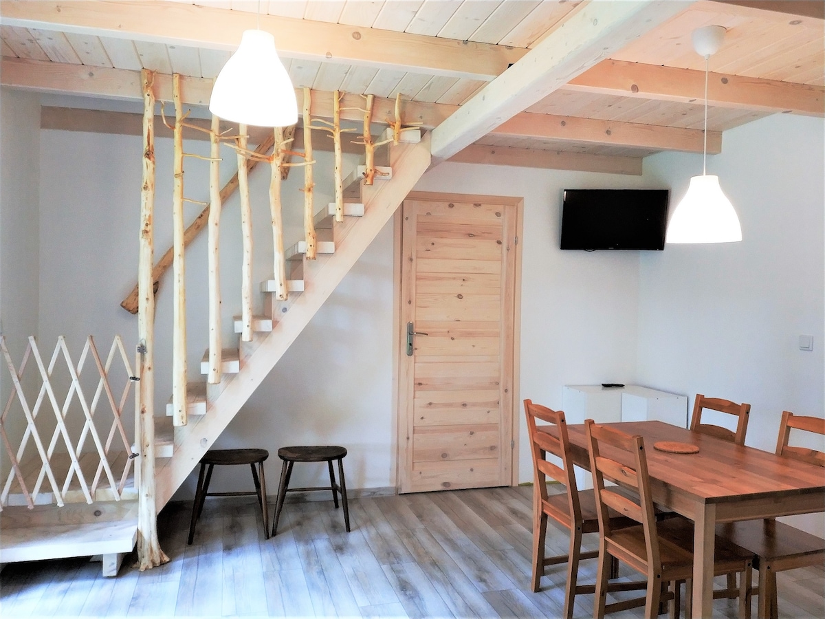 A rural, spacious house (120 m2) with a garden, in a meadow surrounded by a river and forest, guarantees a wonderful holiday. It is perfect for a family or group of friends, up to 8 people. We offer a large garden with a swimming pool (size 6.2 m by 3.2 m, depth 150 cm), outdoor jacuzzi, deckchairs, a separate house to spend time by the fireplace and organize games and activities, and a barbecue.