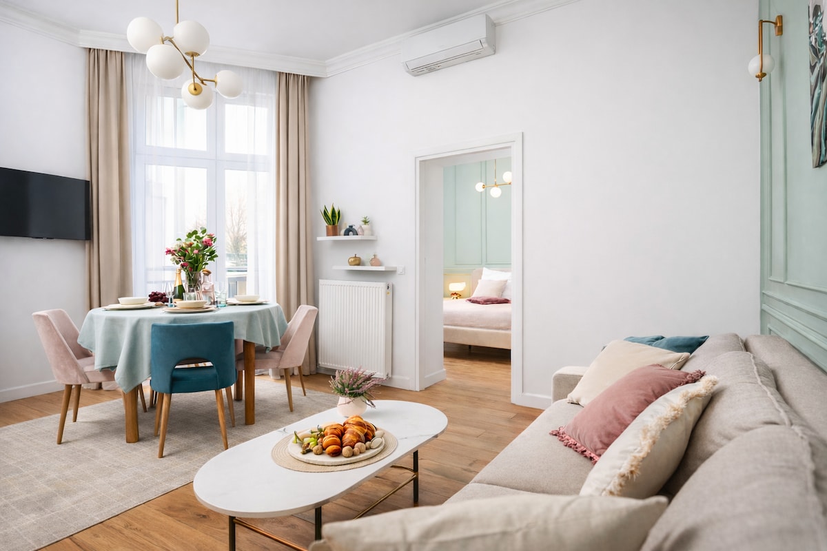 Beautiful, completely renovated, spacious apartment (50 m2) in the heart of the city. Apartment is located 3 min walking from the main train and bus station and in front of the biggest shopping mall Galeria Krakowska. However the windows are facing beautiful park (Strzeleciki) which makes it amazing feeling being outside of town with all the tress around it. Kitchen has all new appliances with over, stove, dishwasher and build in Coffee maker Bosh! Place has a unique design