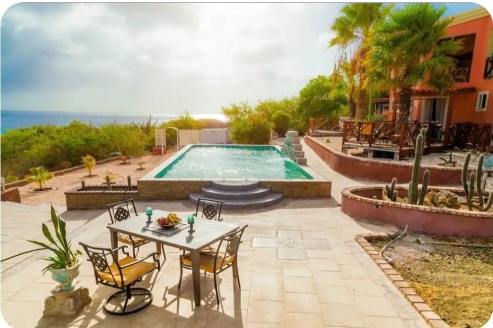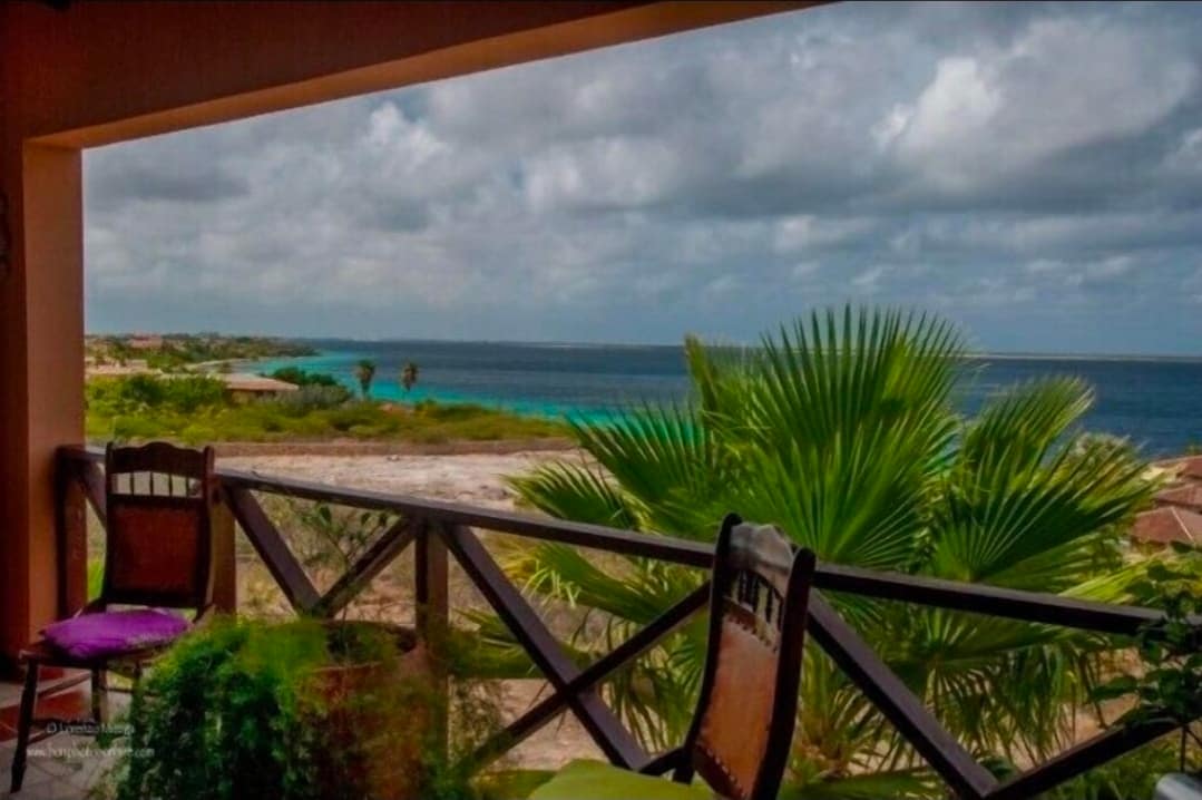 Take a break and unwind at this peaceful oasis.Sea – View private apartment with its own entrance Picturesque ocean- in the most prestigious neighborhood on the island of Bonaire. As you enter this property you will feel and see the sea, ocean and all tranquility that goes with that feeling and a spectacular view of the Caribbean Sea, island of Klein Bonaire, garden with tropical fruits trees mangoes, banana and palm. You can see a spectacular view from your private Balcony.
