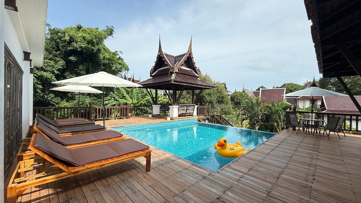 Experience authentic Thailand from a modern and chic villa. This stylish 132 sqm Thai-modern home offers a fully equipped kitchen, A/C throughout, and free Wi-Fi. Relax by the pool just five meters away or take a short 400-meter stroll to Suan Son beach. Towels and linens are provided (220 THB/person/week). Electricity is charged separately based on usage (approx. 1000 THB/week). Resort services are available, and a gym is located 4 km away. Discover unexplored gems in maximum comfort!