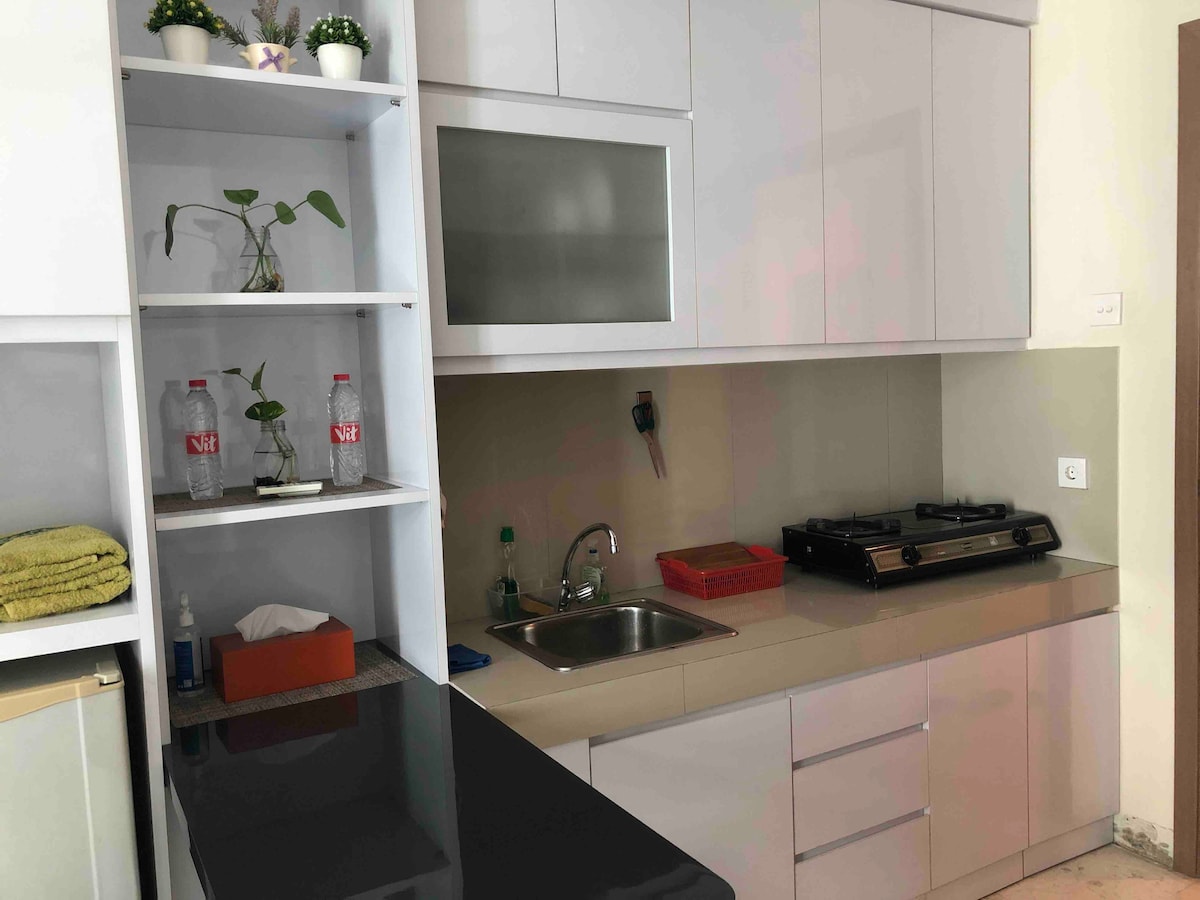 An elegant 24sqm studio in Jakarta's center, blending style and convenience. Includes kitchen, fast Wi-Fi, air-purification, 43" smart TV, sound system and Netflix. It is ideal for various stay types, with contactless access and amenities like pools, jacuzzi, gym, and basketball, Now features a Reverse Osmosis dispenser & food waste disposal, The picture shows a gas stove that has been replaced by an induction cooker (to follow the apartment guidelines for fire hazards)