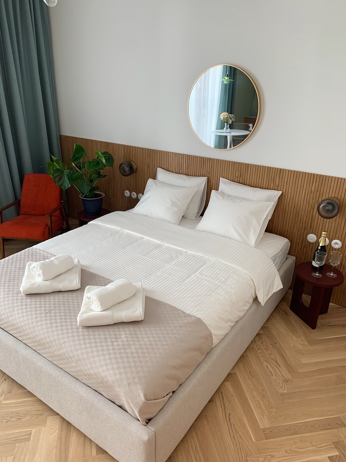 Studio Panorama has a beautiful view on the modern centre of Warsaw as well as on the old town. Old town is 10 min. walk away. Next to the apartment there is underground parking and a park . Public transport is available in the front of the building including tram, buses and metro. The building was constructed in the period of communism of the late 50-ties. We design the interior of the apartment with the elements of this epoque. Bearing in mind safety we make the disinfection after each stay.