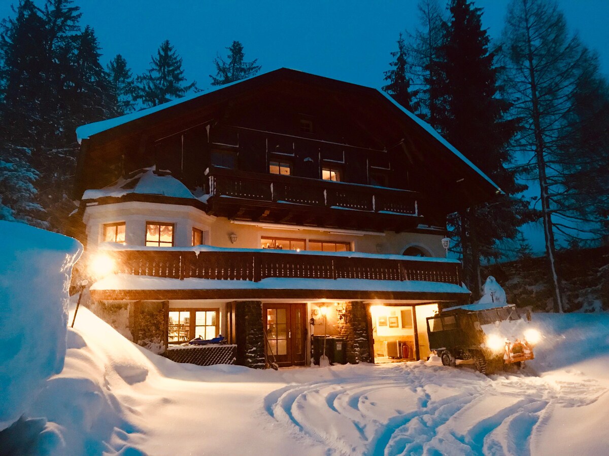 The Chalet is situated in Carinthia in 1875 meters at the beautiful Falkertsee. The house has four exceptional bedrooms with 12 beds. The location is perfect for hiking or skiing in winter. We have a small fitness library and 4 TV`s for rainy days. The brandnew Outdoor Sauna with panorama view and the 50sq. gym with own shower and toilet. Costs on site: electricity according to consumption, additional firewood, visitor's tax, additional garbage bags that are needed