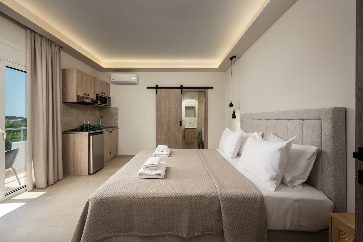 The Athena apartment (80sq.m) has 1 master bedroom, 1 smaller one and can accommodate comfortably up to 6 persons, fully equipped to meet your needs, with ample space and privacy. Furthermore it offers a cozy living and dining area alongside with an amazing view over the brand new swimming pool and Filerimos. **THE SWIMMING POOL IS BRAND NEW AND WILL START OPERATING FROM 1st OF MAY 2022. MOREOVER WE ARE EXTREMELY HAPPY TO ANNOUNCE THAT THE NEW GYM IS READY AND FREE TO USE FOR ALL OF OUR GUESTS.