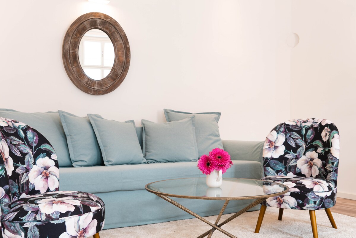 The spacious 70m² two-bedroom apartment, with an open-plan design, has been carefully renovated to offer the highest standard of comfort. The apartment features two bedrooms, modern box spring beds, a comfortable seating area and work desk, as well as two bathrooms with underfloor heating and separate toilets. The view extends to the terraces of the Singerriedl vineyards and local church. Facilities include a kitchen, coffee machine, flat screen TV, telephone and safe.