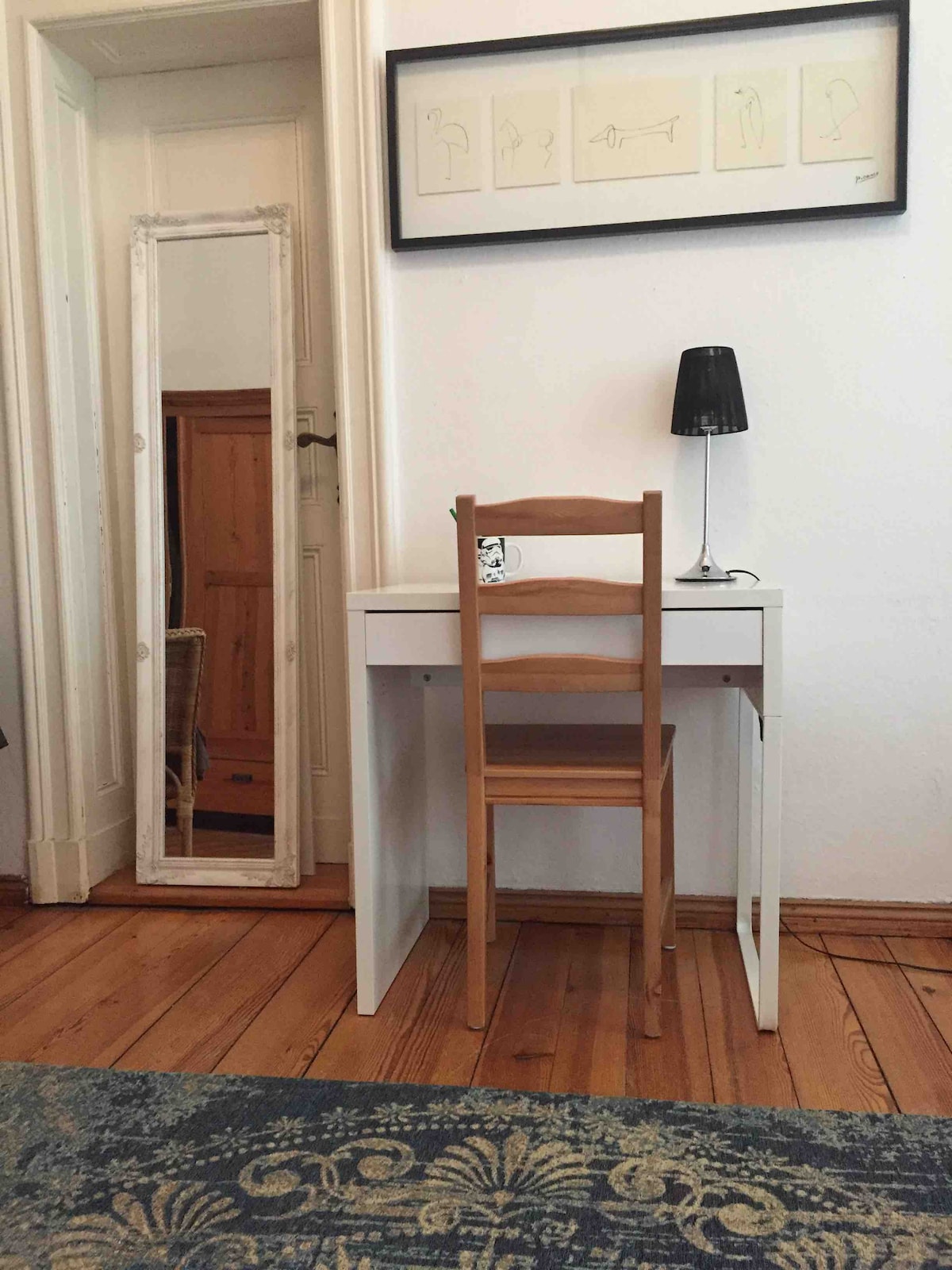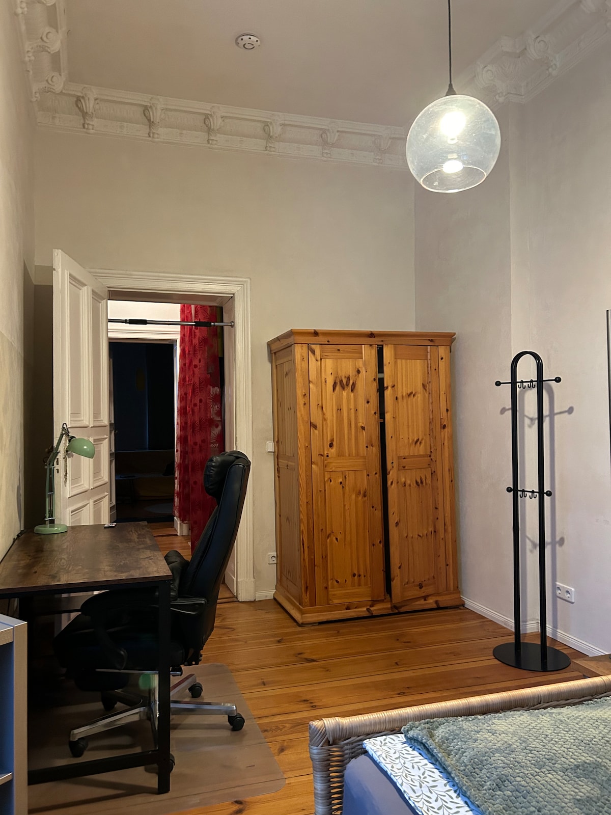 Schönes, helles Zimmer in einer geräumigen Vierzimmerwohnung im grünen Bezirk Treptow. Gute S-Bahn- und Busverbindungen nach Berlin-Mitte. Wir wohnen hier zu dritt: Christoff, Irene und die etwas scheue Hündin Colombina. A pretty room, full of light in a nice and spacious flat in the green area Treptow. Good train and bus connections into the city. There are three of us living here: Christoff, Irene and our dog Colombina.