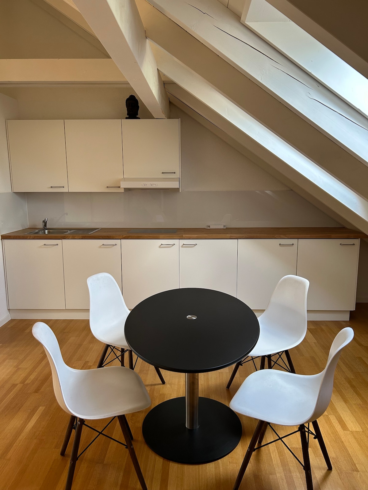 A lovely, newly renovated roof studio equipped with air conditioning. Located in the centre of Konstanz near „Seerhein“ the roof studio can be easily reached by all means of transportation. There are cafes, shopping facilities and a bakery nearby. The studio is perfectly designed for all people who want to feel at ease in the middle of the town. The bathroom is small but practically arranged. There is a kitchenette with a fridge, a stove and a dishwasher.