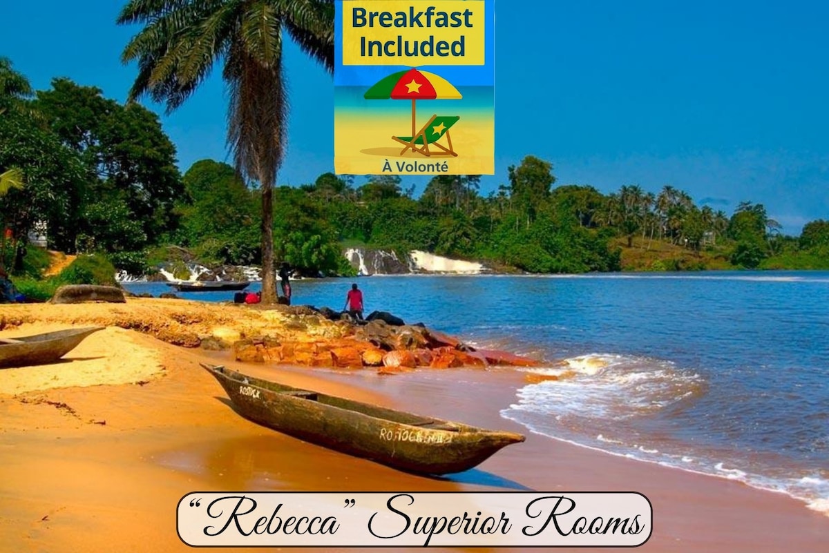 " Rebecca" Superior Double Room with balcony, elegant and bright, just steps from the beach. Queen bed, air conditioning, Wi-Fi, TV; bathroom with walk-in shower, desk, and storage. Balcony overlooking the garden to enjoy nature. Included access: 2 swimming pools + jacuzzi, secure parking, 24/7 reception. Restaurant Au Plaisir du Goût (-10%) right on the beach. Nature excursions (Lobé Falls, mangroves). Breakfast optional; housekeeping and extras available on site